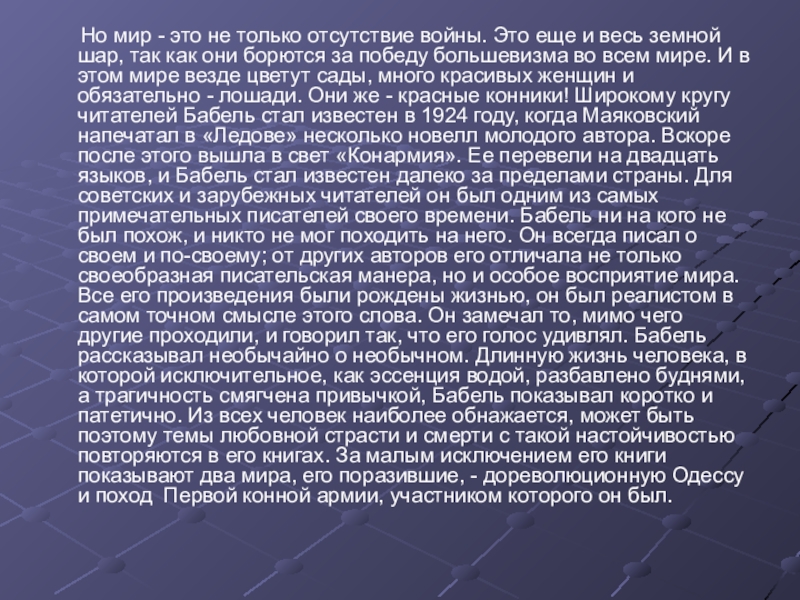 Это еще и весь земной шар, так как они борются за победу большевизма во всем мире. И в этом мире везде цветут сады, много красивых женщин и обязательно - лошади. Они же - красные конники! Широкому кругу читателей Бабель стал известен в 1924 году, когда Маяковский напечатал в «Ледове» несколько новелл молодого автора. Вскоре после этого вышла в свет «Конармия». Ее перевели на двадцать языков, и Бабель стал известен далеко за пределами страны. Для советских и зарубежных читателей он был одним из самых примечательных писателей своего времени. Бабель ни на кого не был похож, и никто не мог походить на него. Он всегда писал о своем и по-своему; от других авторов его отличала не только своеобразная писательская манера, но и особое восприятие мира. Все его произведения были рождены жизнью, он был реалистом в самом точном смысле этого слова. Он замечал то, мимо чего другие проходили, и говорил так, что его голос удивлял. Бабель рассказывал необычайно о необычном. Длинную жизнь человека, в которой исключительное, как эссенция водой, разбавлено буднями, а трагичность смягчена привычкой, Бабель показывал коротко и патетично. Из всех человек наиболее обнажается, может быть поэтому темы любовной страсти и смерти с такой настойчивостью повторяются в его книгах. За малым исключением его книги показывают два мира, его поразившие, - дореволюционную Одессу и поход Первой конной армии, участником которого он был.