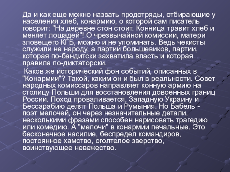 у населения хлеб, конармию, о которой сам писатель говорит: "На деревне стон стоит. Конница травит хлеб и меняет лошадей"! О чрезвычайной комиссии, матери зловещего КГБ, можно и не упоминать. Ведь чекисты служили не народу, а партии большевиков, партии, которая по-бандитски захватила власть и которая правила по-диктаторски.