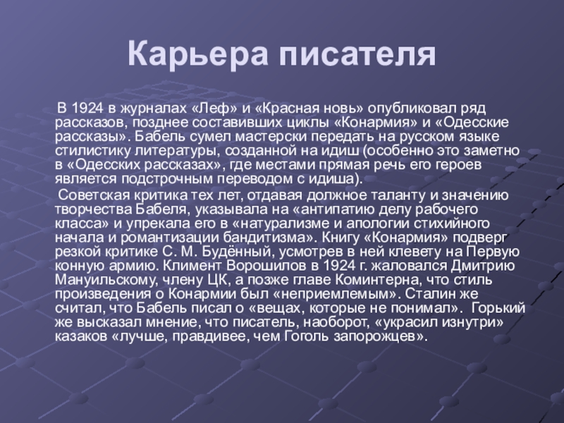 Советская критика тех лет, отдавая должное таланту и значению творчества Бабеля, указывала на «антипатию делу рабочего класса» и упрекала его в «натурализме и апологии стихийного начала и романтизации бандитизма». Книгу «Конармия» подверг резкой критике С. М. Будённый, усмотрев в ней клевету на Первую конную армию. Климент Ворошилов в 1924 г. жаловался Дмитрию Мануильскому, члену ЦК, а позже главе Коминтерна, что стиль произведения о Конармии был «неприемлемым». Сталин же считал, что Бабель писал о «вещах, которые не понимал». Горький же высказал мнение, что писатель, наоборот, «украсил изнутри» казаков «лучше, правдивее, чем Гоголь запорожцев».