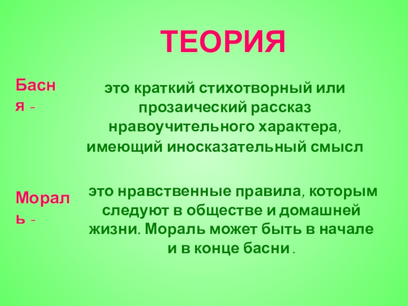 это нравственные правила, которым следуют в обществе и домашней жизни. Мораль может быть в начале и в конце басни .