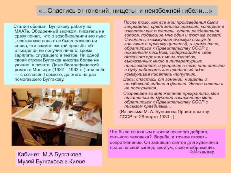 Сталин обещал Булгакову работу во МХАТе. Ободренный звонком, писатель не сразу понял, что о возобновлении его пьес , постановке новых не было сказано ни слова, что взамен взятой просьбы об отъезде он не получил ничего, кроме зарплаты служащего в театре. Ни одной своей строки Булгаков никогда более не увидел в печати. Даже биографический роман о Мольере (1932—1933 гг.) отклонён — с согласия Горького, до этого не раз помогавшего Булгакову.