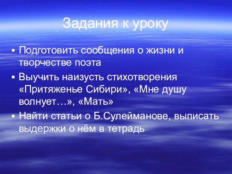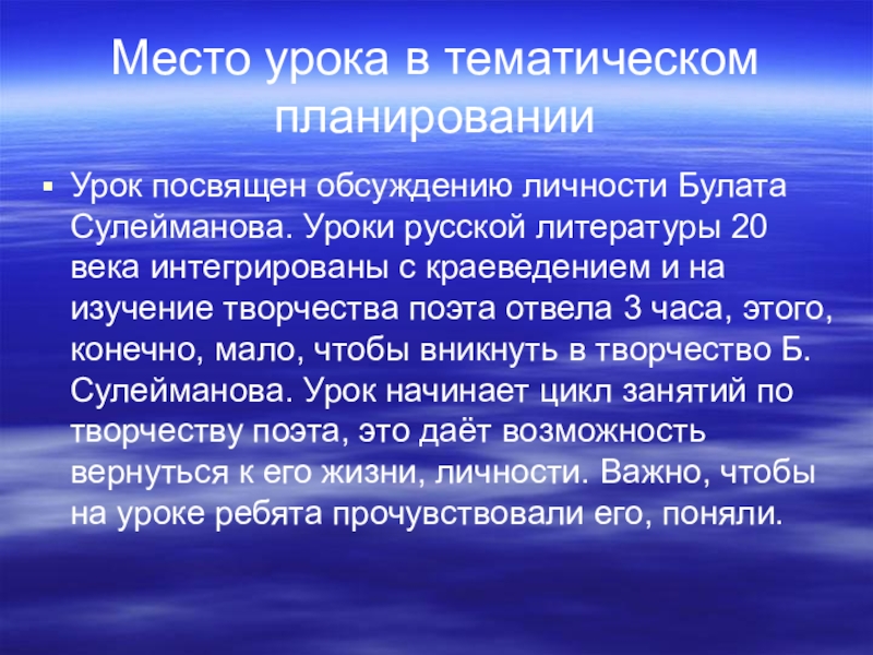 русской литературы 20 века интегрированы с краеведением и на изучение творчества поэта отвела 3 часа, этого, конечно, мало, чтобы вникнуть в творчество Б.Сулейманова. Урок начинает цикл занятий по творчеству поэта, это даёт возможность вернуться к его жизни, личности. Важно, чтобы на уроке ребята прочувствовали его, поняли.
