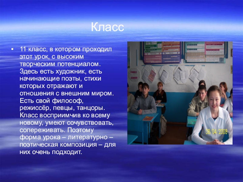 Здесь есть художник, есть начинающие поэты, стихи которых отражают и отношения с внешним миром. Есть свой философ, режиссёр, певцы, танцоры. Класс восприимчив ко всему новому, умеют сочувствовать, сопереживать. Поэтому форма урока – литературно – поэтическая композиция – для них очень подходит.