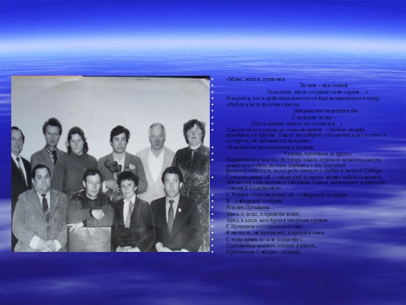 Стихотворение «Я – сибирский татарин» являет собой основной лейтмотив одноименного сборника стихов, вышедшего в канун 60 – летия Б.Сулейманова.