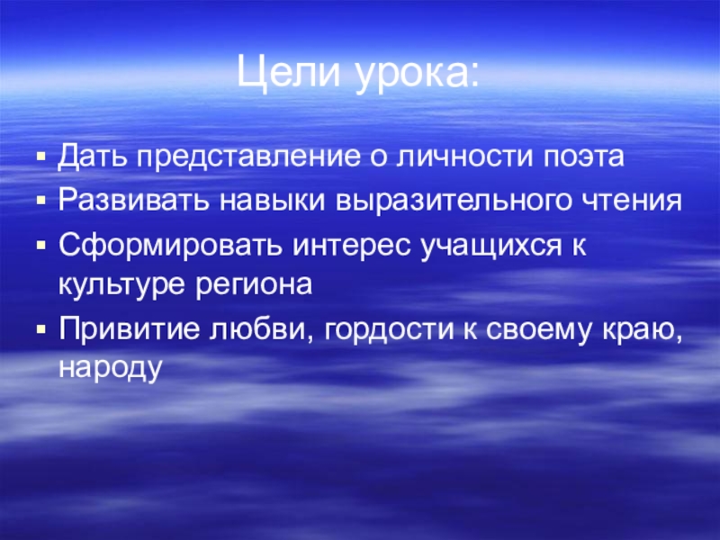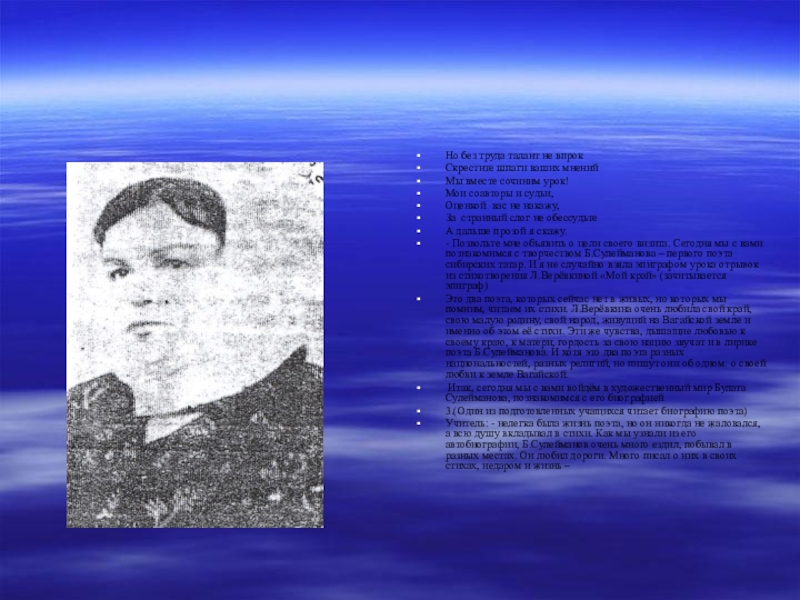 - Позвольте мне объявить о цели своего визита. Сегодня мы с вами познакомимся с творчеством Б.Сулейманова – первого поэта сибирских татар. И я не случайно взяла эпиграфом урока отрывок из стихотворения Л.Верёвкиной «Мой край» (зачитывается эпиграф)