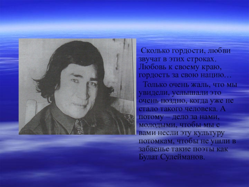 Только очень жаль, что мы увидели, услышали это очень поздно, когда уже не стало такого человека. А потому – дело за нами, молодыми, чтобы мы с вами несли эту культуру потомкам, чтобы не ушли в забвенье такие поэты как Булат Сулейманов.