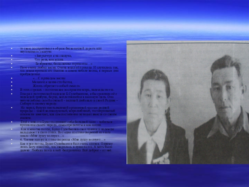 Учитель: - нелегка была жизнь поэта, но он никогда не жаловался, а всю душу вкладывал в стихи. Как мы узнали из его автобиографии, Б.Сулейманов очень много ездил, побывал в разных местах. Он любил дороги. Много писал о них в своих стихах, недаром и жизнь –