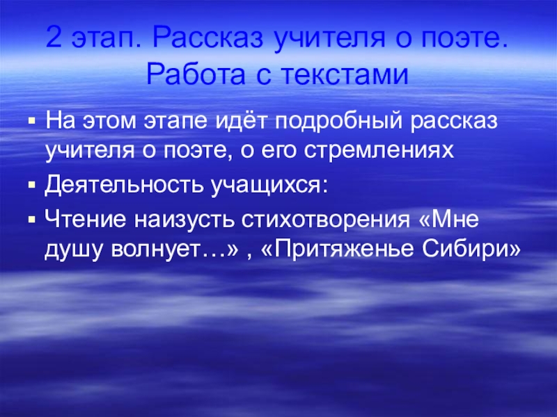 Слайд 152 этап. Рассказ учителя о поэте. Работа с текстами