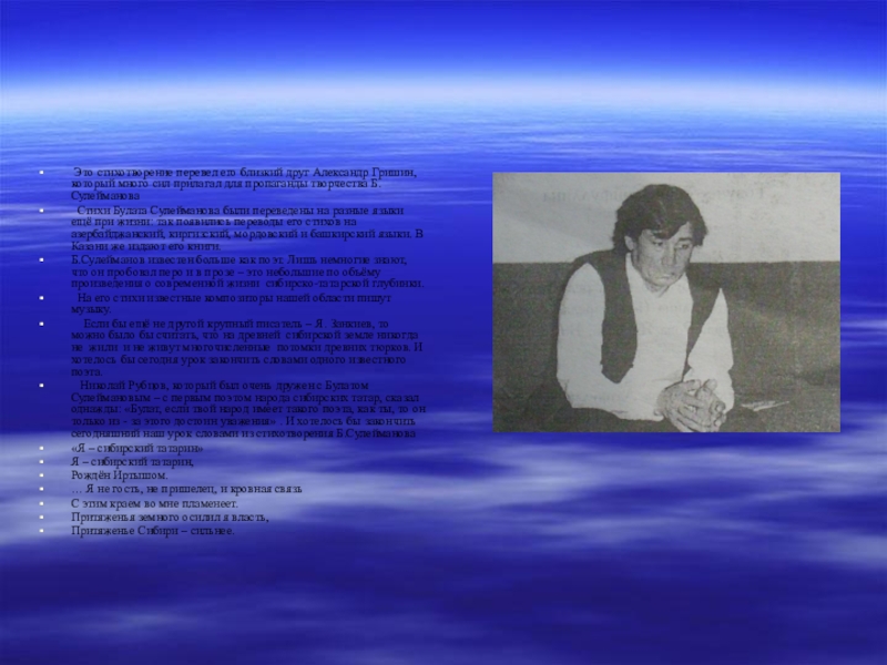 Николай Рубцов, который был очень дружен с Булатом Сулеймановым – с первым поэтом народа сибирских татар, сказал однажды: «Булат, если твой народ имеет такого поэта, как ты, то он только из - за этого достоин уважения» . И хотелось бы закончить сегодняшний наш урок словами из стихотворения Б.Сулейманова