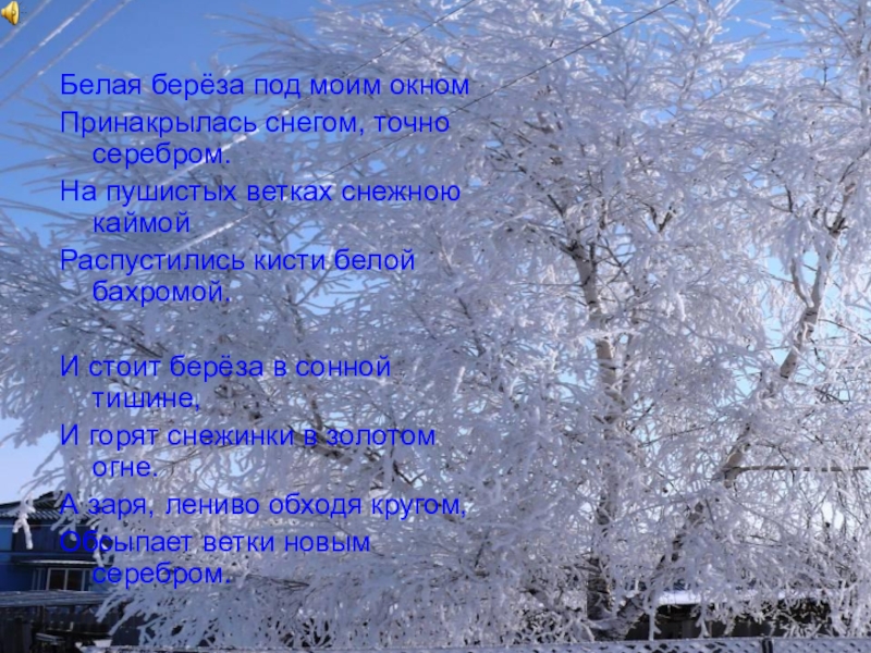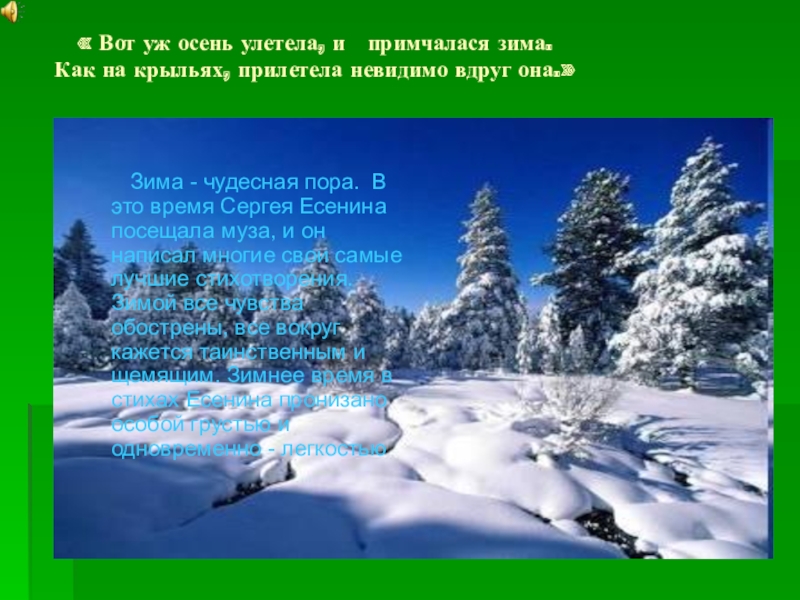 Зима - чудесная пора. В это время Сергея Есенина посещала муза, и он написал многие свои самые лучшие стихотворения. Зимой все чувства обострены, все вокруг кажется таинственным и щемящим. Зимнее время в стихах Есенина пронизано особой грустью и одновременно - легкостью