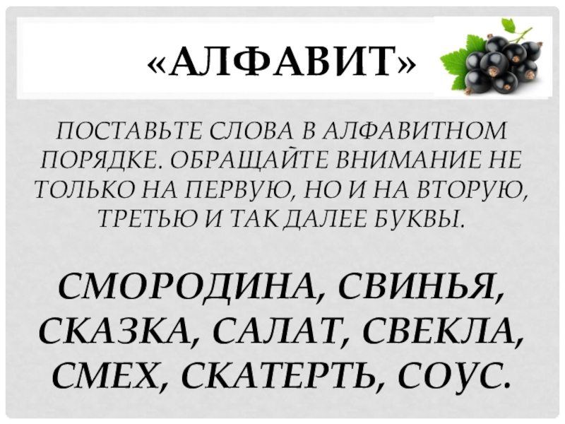 «Алфавит»  Поставьте слова в алфавитном порядке. Обращайте внимание не только на первую, но и