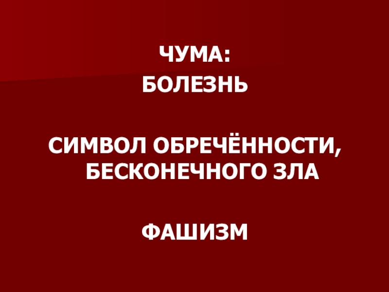 По словам автора, содержание «Чумы» — это борьба европейского сопротивления против нацизмаПо словам автора, содержание «Чумы» — это борьба европейского сопротивления против нацизма и фашизмаПо словам автора, содержание «Чумы» — это борьба европейского сопротивления против нацизма и фашизма. Но этим содержание его не исчерпывается. Как отметил Альбер Камю, он «распространил значение этого образа (чумы) на бытие в целом». Это не только чума (коричневая чумаПо словам автора, содержание «Чумы» — это борьба европейского сопротивления против нацизма и фашизма. Но этим содержание его не исчерпывается. Как отметил Альбер Камю, он «распространил значение этого образа (чумы) на бытие в целом». Это не только чума (коричневая чума, как называли фашизм в Европе), а зло вообще, неотделимое от бытия,