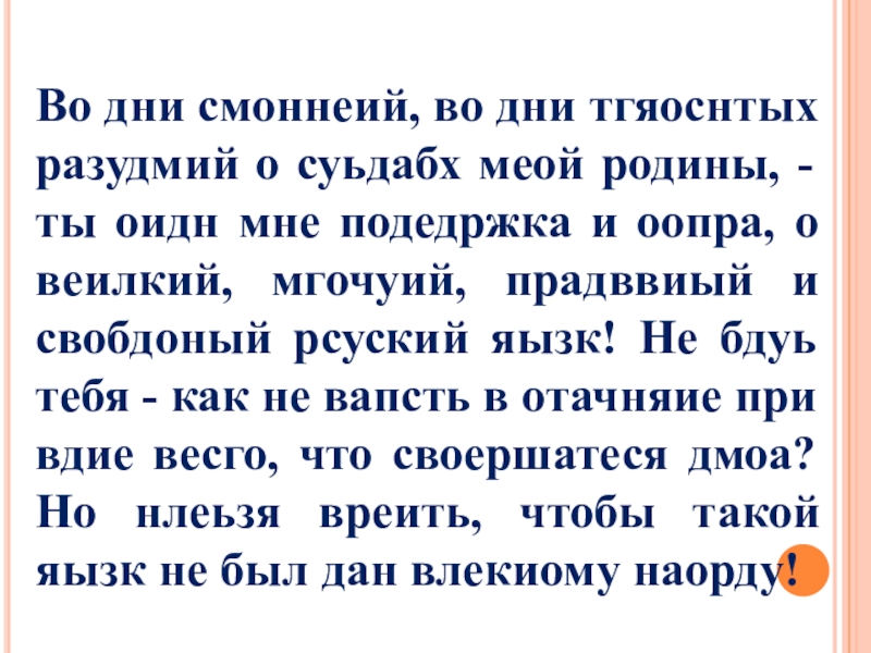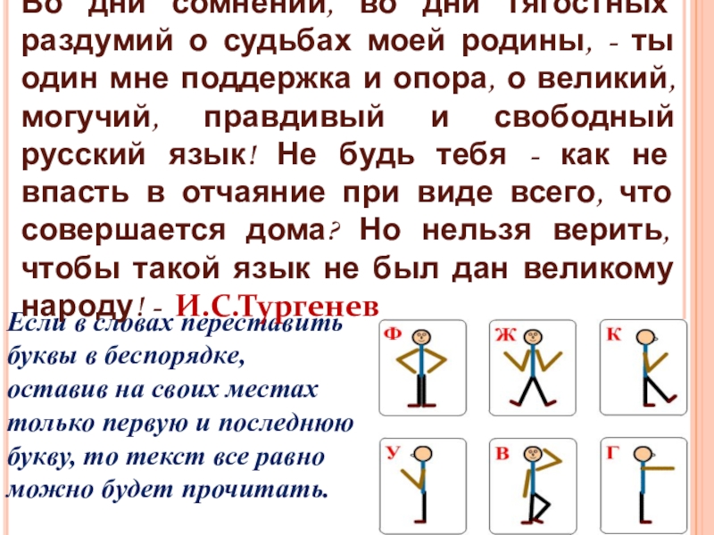 Во дни сомнений, во дни тягостных раздумий о судьбах моей родины, - ты один мне поддержка и опора, о великий, могучий, правдивый и свободный русский язык! Не будь тебя - как не впасть в отчаяние при виде всего, что совершается дома? Но нельзя верить, чтобы такой язык не был дан великому народу! - И.С.Тургенев