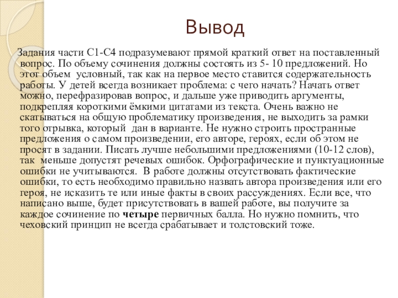 вопрос. По объему сочинения должны состоять из 5- 10 предложений. Но этот объем условный, так как на первое место ставится содержательность работы. У детей всегда возникает проблема: с чего начать? Начать ответ можно, перефразировав вопрос, и дальше уже приводить аргументы, подкрепляя короткими ёмкими цитатами из текста. Очень важно не скатываться на общую проблематику произведения, не выходить за рамки того отрывка, который дан в варианте. Не нужно строить пространные предложения о самом произведении, его авторе, героях, если об этом не просят в задании. Писать лучше небольшими предложениями (10-12 слов), так меньше допустят речевых ошибок. Орфографические и пунктуационные ошибки не учитываются. В работе должны отсутствовать фактические ошибки, то есть необходимо правильно назвать автора произведения или его героя, не исказить те или иные факты в своих рассуждениях. Если все, что написано выше, будет присутствовать в вашей работе, вы получите за каждое сочинение по четыре первичных балла. Но нужно помнить, что чеховский принцип не всегда срабатывает и толстовский тоже.