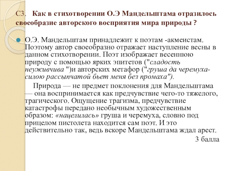 Слайд 36С3. Как в стихотворении О.Э Мандельштама отразилось своеобразие авторского восприятия