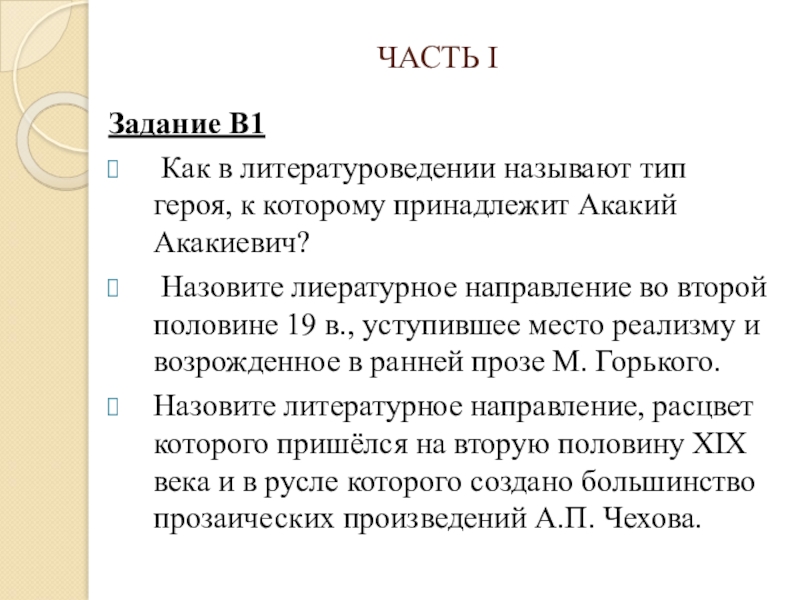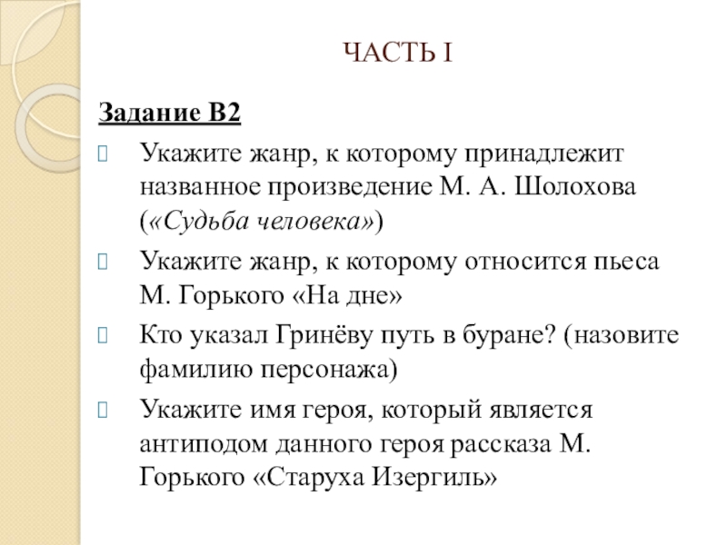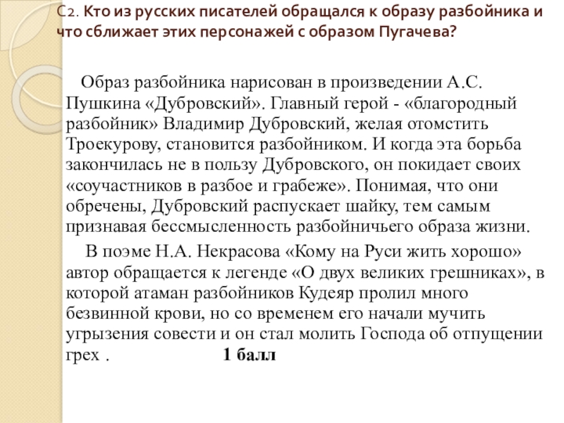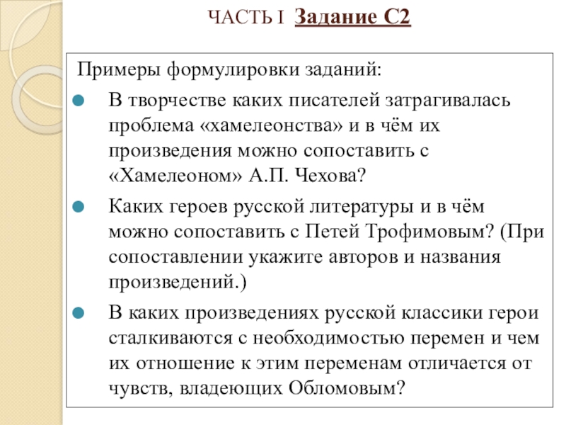 С5.2, С5.3) проверяется умение построить связное содержательное речевое высказывание на заданную литературную тему, сформулированную в виде вопроса проблемного характера. Выпускнику предлагается 3 вопроса, охватывающие важнейшие вехи отечественного историко-литературного процесса: