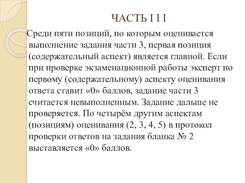 выполнение задания части 3, первая позиция (содержательный аспект) является главной. Если при проверке экзаменационной работы эксперт по первому (содержательному) аспекту оценивания ответа ставит «0» баллов, задание части 3 считается невыполненным. Задание дальше не проверяется. По четырём другим аспектам (позициям) оценивания (2, 3, 4, 5) в протокол проверки ответов на задания бланка № 2 выставляется «0» баллов.