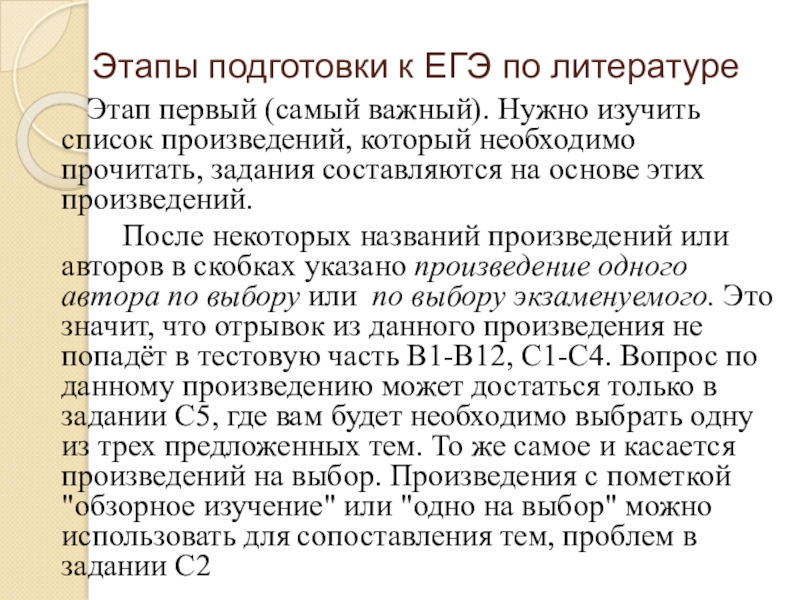 После некоторых названий произведений или авторов в скобках указано произведение одного автора по выбору или по выбору экзаменуемого. Это значит, что отрывок из данного произведения не попадёт в тестовую часть В1-В12, С1-С4. Вопрос по данному произведению может достаться только в задании С5, где вам будет необходимо выбрать одну из трех предложенных тем. То же самое и касается произведений на выбор. Произведения с пометкой "обзорное изучение" или "одно на выбор" можно использовать для сопоставления тем, проблем в задании С2