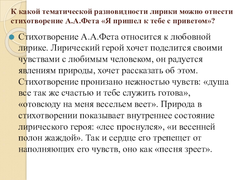 Слайд 37К какой тематической разновидности лирики можно отнести стихотворение А.А.Фета «Я пришел