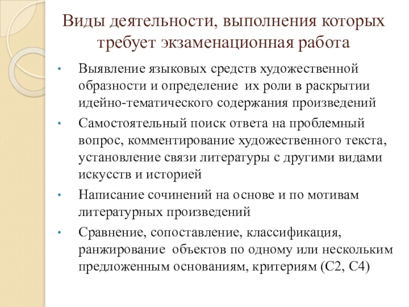 Слайд 8Виды деятельности, выполнения которых требует экзаменационная работа