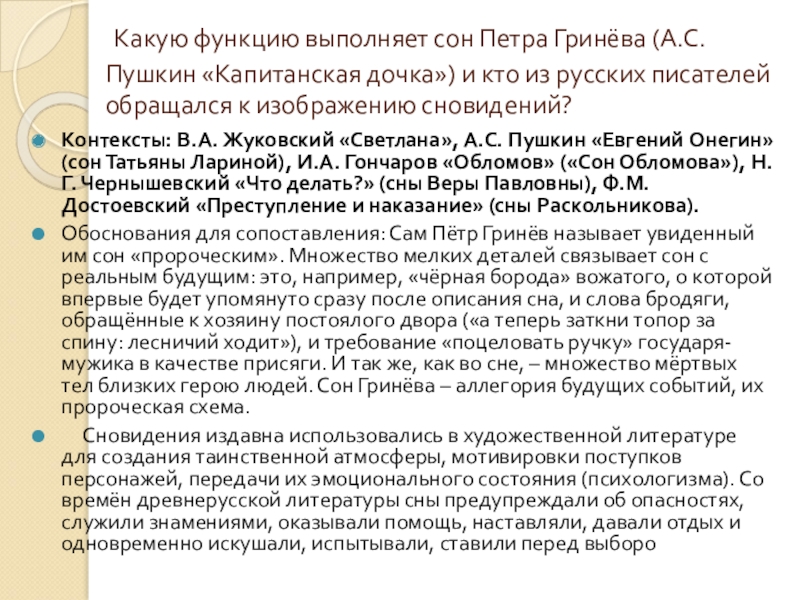 Контексты: В.А. Жуковский «Светлана», А.С. Пушкин «Евгений Онегин» (сон Татьяны Лариной), И.А. Гончаров «Обломов» («Сон Обломова»), Н.Г. Чернышевский «Что делать?» (сны Веры Павловны), Ф.М. Достоевский «Преступление и наказание» (сны Раскольникова).