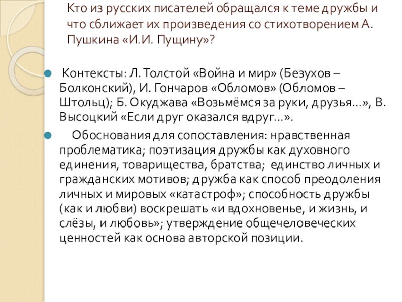 Слайд 40Кто из русских писателей обращался к теме дружбы и что сближает