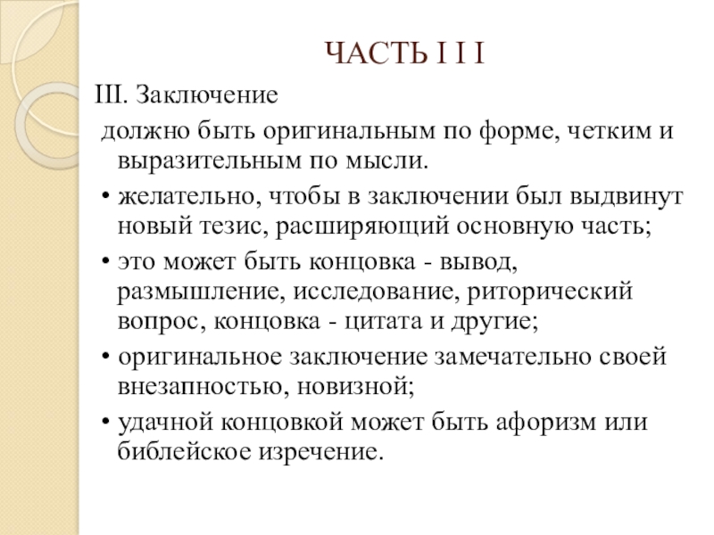 • желательно, чтобы в заключении был выдвинут новый тезис, расширяющий основную часть;