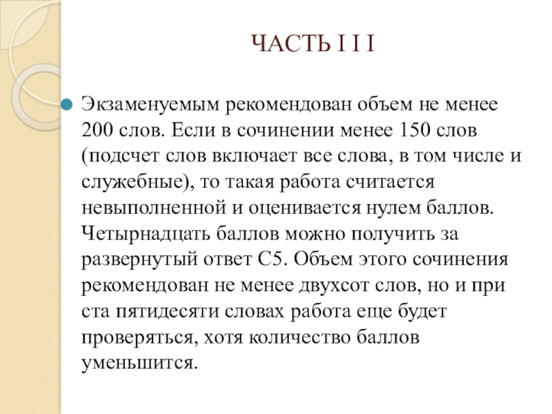 в сочинении менее 150 слов (подсчет слов включает все слова, в том числе и служебные), то такая работа считается невыполненной и оценивается нулем баллов. Четырнадцать баллов можно получить за развернутый ответ С5. Объем этого сочинения рекомендован не менее двухсот слов, но и при ста пятидесяти словах работа еще будет проверяться, хотя количество баллов уменьшится.