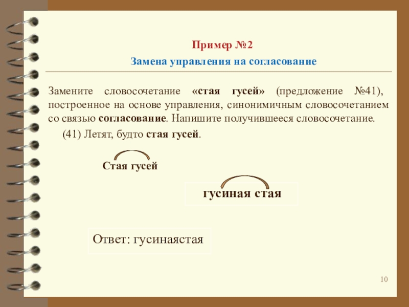 Замените словосочетание «стая гусей» (предложение №41), построенное на основе управления, синонимичным словосочетанием со связью согласование. Напишите получившееся словосочетание.