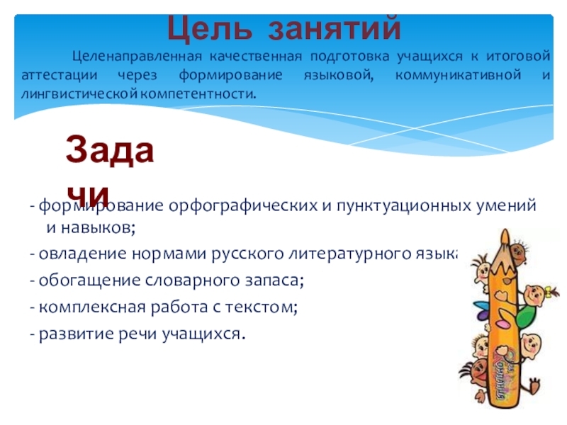 Целенаправленная качественная подготовка учащихся к итоговой аттестации через формирование языковой, коммуникативной и лингвистической компетентности.