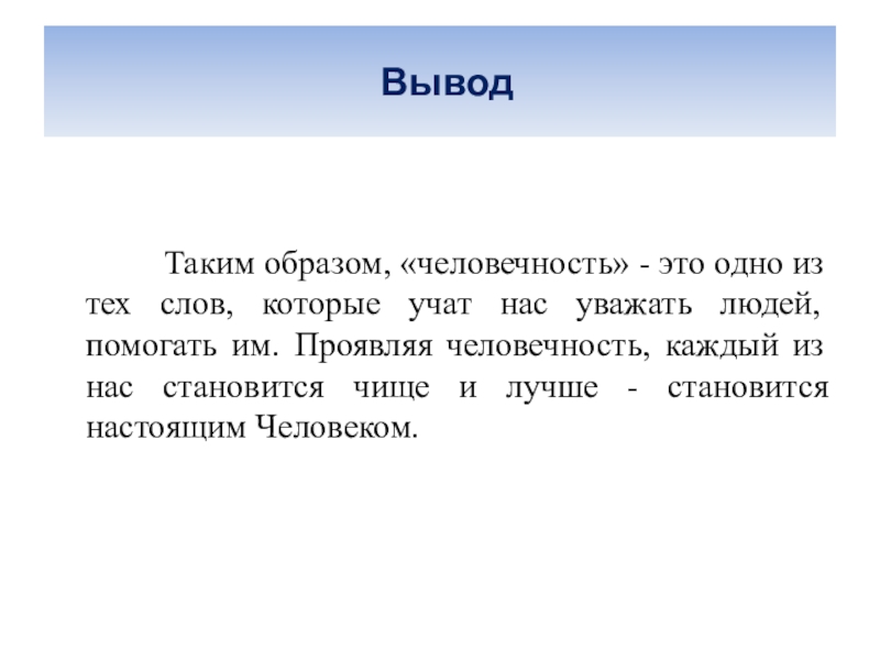 Таким образом, «человечность» - это одно из тех слов, которые учат нас уважать людей, помогать им. Проявляя человечность, каждый из нас становится чище и лучше - становится настоящим Человеком.
