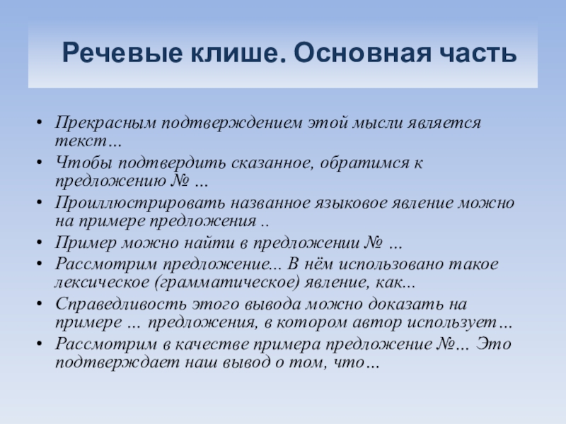 Слайд 40 Речевые клише. Основная часть