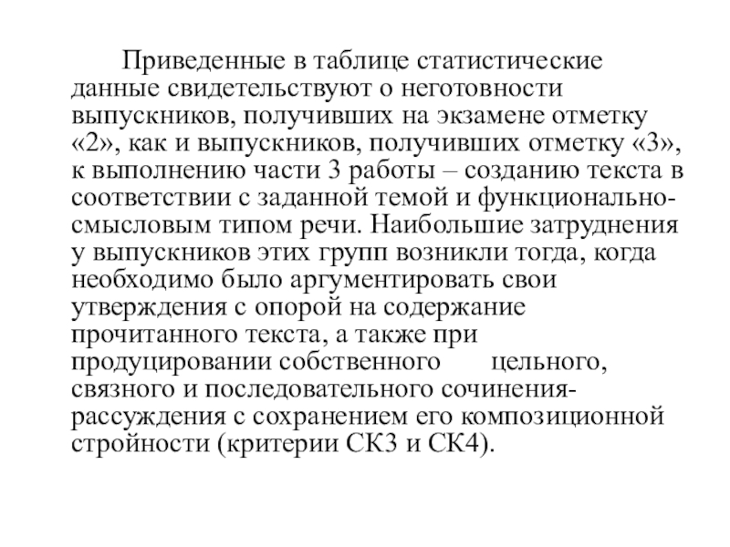 свидетельствуют о неготовности выпускников, получивших на экзамене отметку «2», как и выпускников, получивших отметку «3», к выполнению части 3 работы – созданию текста в соответствии с заданной темой и функционально-смысловым типом речи. Наибольшие затруднения у выпускников этих групп возникли тогда, когда необходимо было аргументировать свои утверждения с опорой на содержание прочитанного текста, а также при продуцировании собственного цельного, связного и последовательного сочинения-рассуждения с сохранением его композиционной стройности (критерии СК3 и СК4).