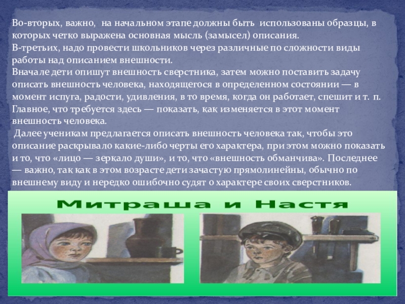 Далее ученикам предлагается описать внешность человека так, чтобы это описание раскрывало какие-либо черты его характера, при этом можно показать и то, что «лицо — зеркало души», и то, что «внешность обманчива». Последнее — важно, так как в этом возрасте дети зачастую прямолинейны, обычно по внешнему виду и нередко ошибочно судят о характере своих сверстников.