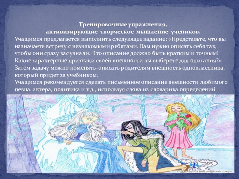 к окружающим их людям, обогащает речь учащихся «портретной» лексикой и имеет большое значение для преподавания литературы. В процессе творческой деятельности ученики осознают, как через описание внешности можно передать внутренний мир героя, выразить свое отношение к нему. Кроме того, работа над описанием внешности готовит учащихся к сочинениям на литературные темы .