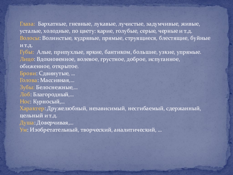 карие, голубые, серые, черные и т.д. Волосы: Волнистые, кудрявые, прямые, струящиеся, блестящие, буйные и т.д.