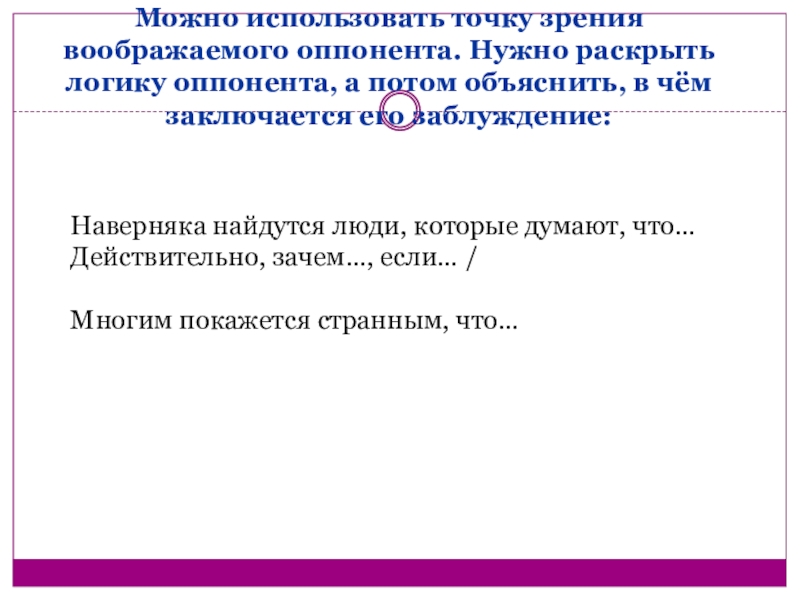 Слайд 18Можно использовать точку зрения воображаемого оппонента. Нужно раскрыть логику оппонента, а