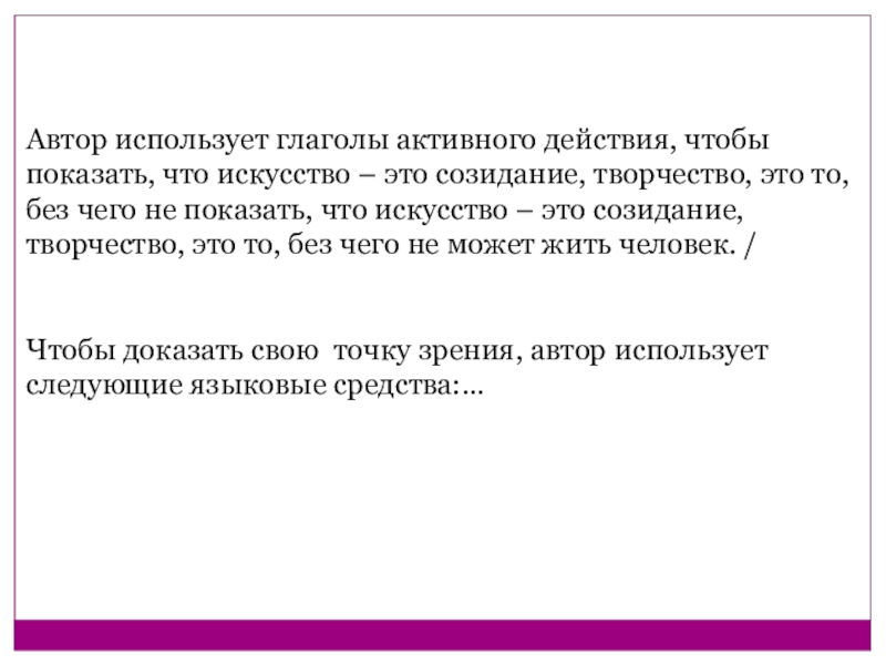 Автор использует глаголы активного действия, чтобы показать, что искусство – это