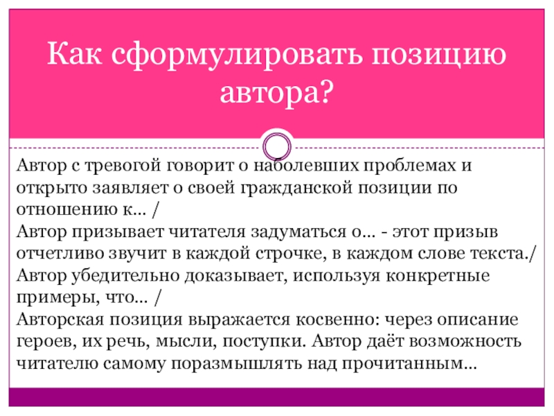 Авторская позиция выражается косвенно: через описание героев, их речь, мысли, поступки. Автор даёт возможность читателю самому поразмышлять над прочитанным…