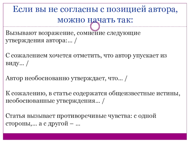 Слайд 19Если вы не согласны с позицией автора, можно начать так: