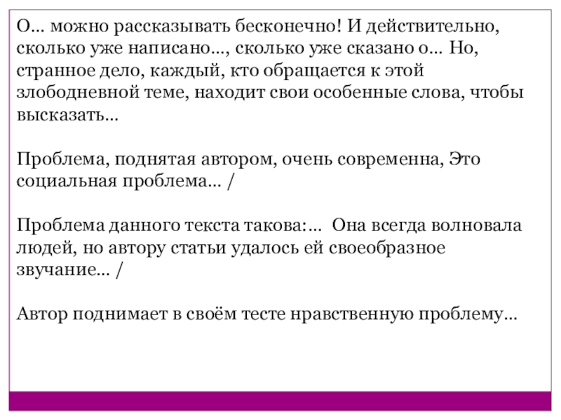 Проблема данного текста такова:… Она всегда волновала людей, но автору статьи удалось ей своеобразное звучание… /