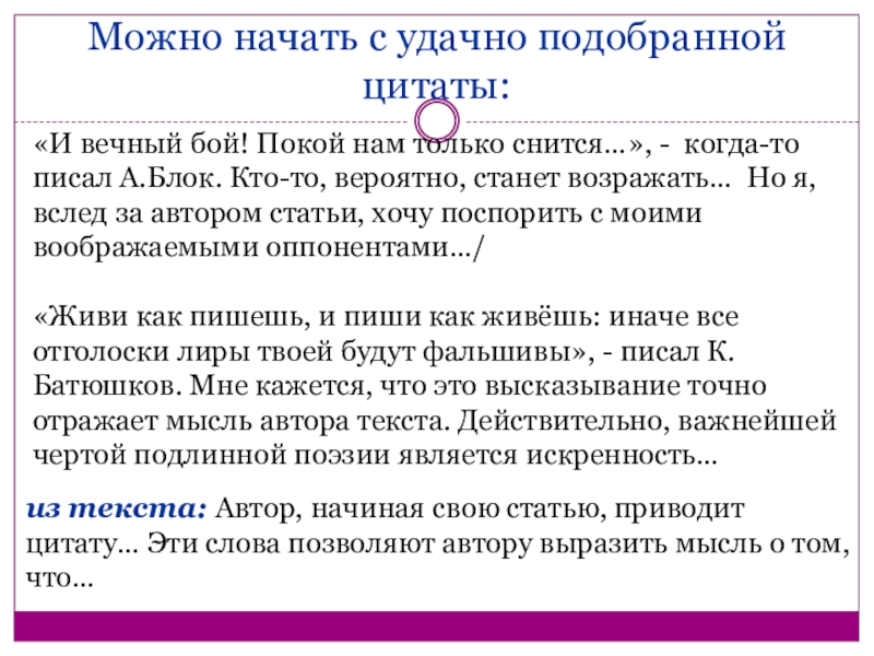 из текста: Автор, начиная свою статью, приводит цитату… Эти слова позволяют автору выразить мысль о том, что…