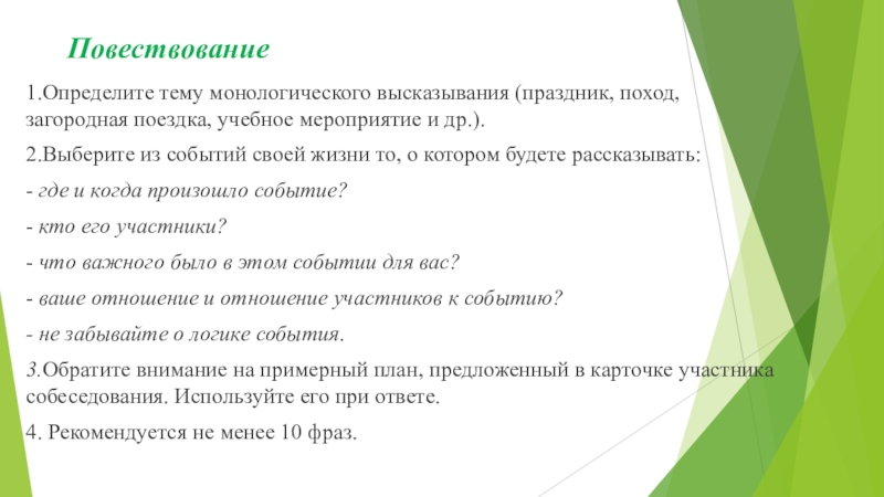 Повествование1.Определите тему монологического высказывания (праздник, поход, загородная поездка, учебное мероприятие и др.). 2.Выберите из событий своей жизни