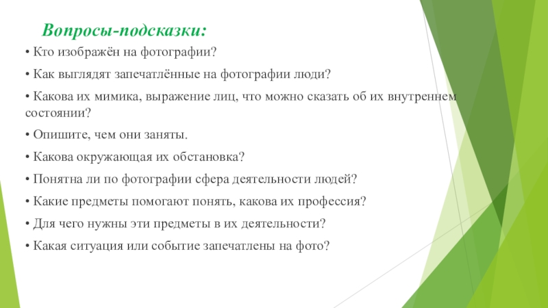 Вопросы-подсказки: • Кто изображён на фотографии?• Как выглядят запечатлённые на фотографии люди?• Какова их мимика, выражение лиц,