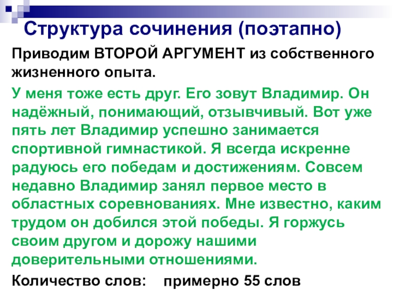 есть друг. Его зовут Владимир. Он надёжный, понимающий, отзывчивый. Вот уже пять лет Владимир успешно занимается спортивной гимнастикой. Я всегда искренне радуюсь его победам и достижениям. Совсем недавно Владимир занял первое место в областных соревнованиях. Мне известно, каким трудом он добился этой победы. Я горжусь своим другом и дорожу нашими доверительными отношениями.