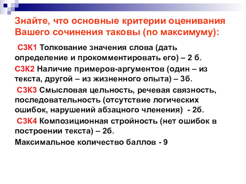 Слайд 12Знайте, что основные критерии оценивания Вашего сочинения таковы (по максимуму):