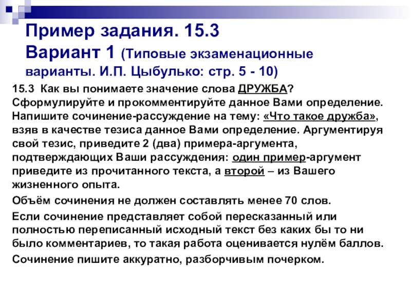 15.3 Как вы понимаете значение слова ДРУЖБА? Сформулируйте и прокомментируйте данное Вами определение. Напишите сочинение-рассуждение на тему: «Что такое дружба», взяв в качестве тезиса данное Вами определение. Аргументируя свой тезис, приведите 2 (два) примера-аргумента, подтверждающих Ваши рассуждения: один пример-аргумент приведите из прочитанного текста, а второй – из Вашего жизненного опыта.