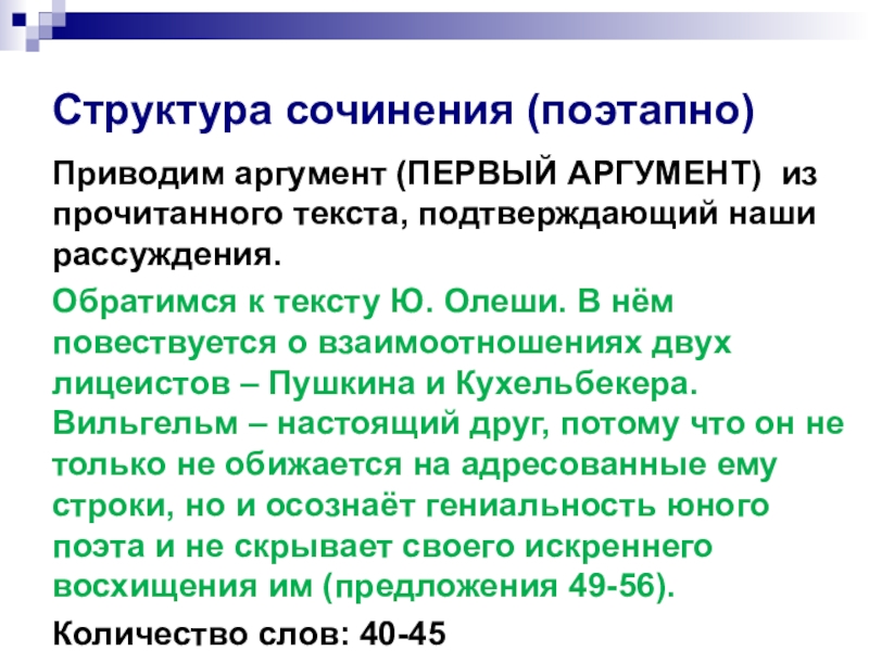 Обратимся к тексту Ю. Олеши. В нём повествуется о взаимоотношениях двух лицеистов – Пушкина и Кухельбекера. Вильгельм – настоящий друг, потому что он не только не обижается на адресованные ему строки, но и осознаёт гениальность юного поэта и не скрывает своего искреннего восхищения им (предложения 49-56).