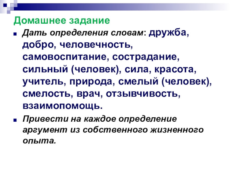 Дать определения словам: дружба, добро, человечность, самовоспитание, сострадание, сильный (человек),
