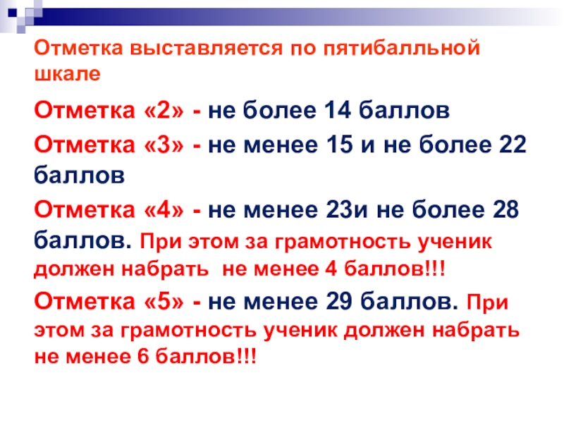 Отметка «5» - не менее 29 баллов. При этом за грамотность ученик должен набрать не менее 6 баллов!!!